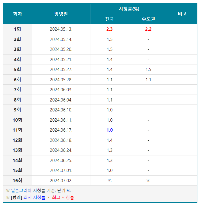 •방송 기간 : 2024년 5월 13일 ~ 2024년 7월 2일